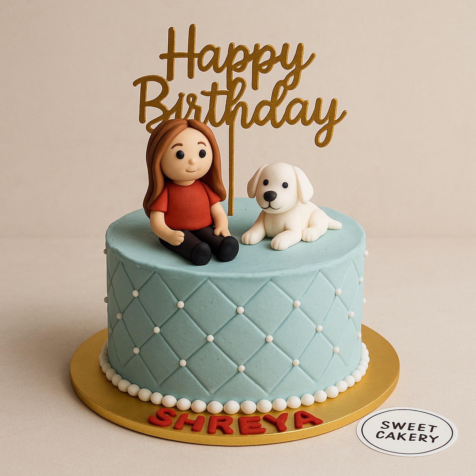 Celebrate with a sweet girl and pet dog theme cake featuring fondant figurines, quilted cream finish, and red name detail. 100% eggless. Bangalore delivery.