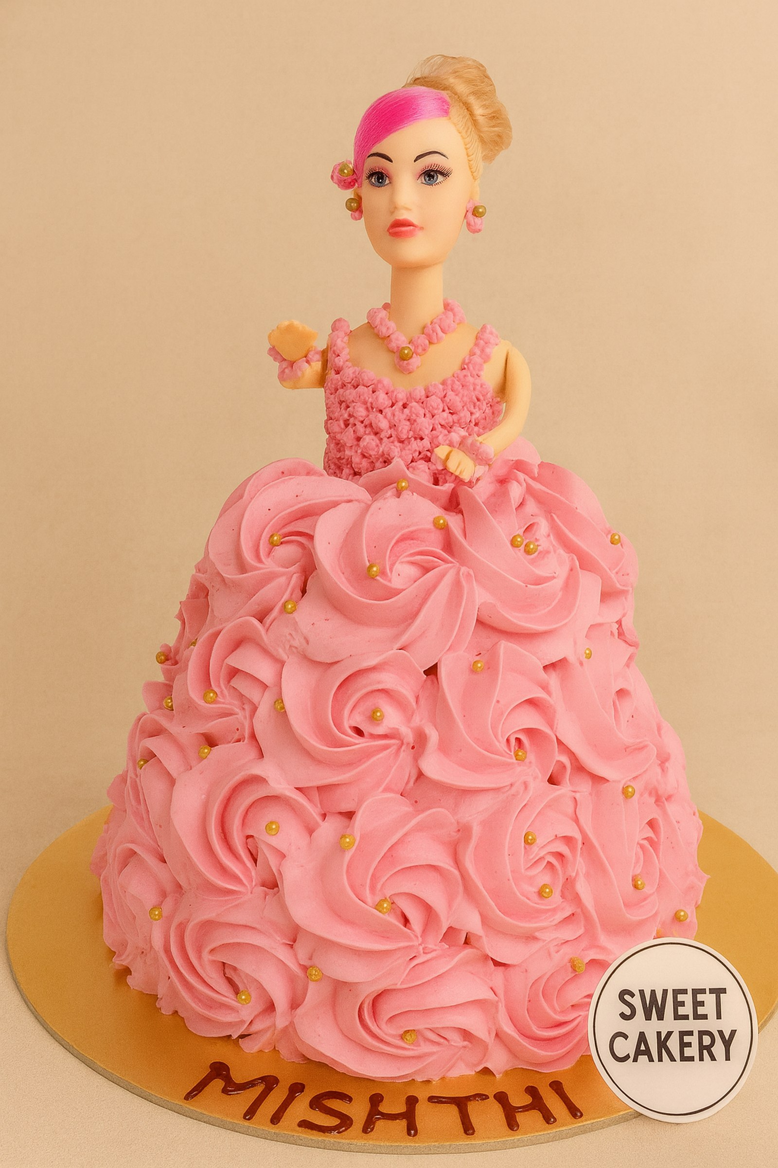 The cake features a full-bodied cream dress piped in elegant pink rosettes with golden pearls.