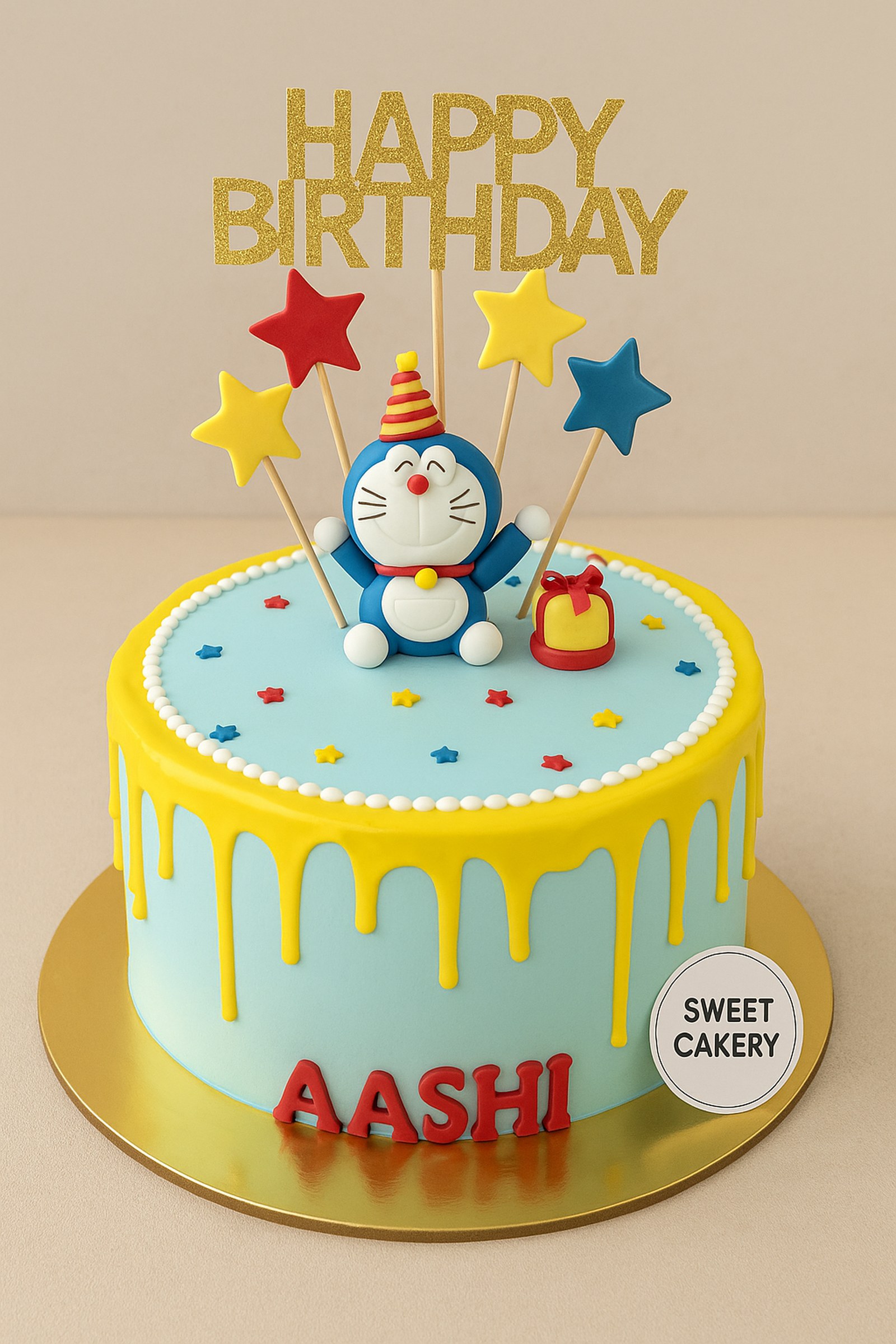 The design includes a fondant Doremon topper wearing a party hat, surrounded by stars and a gift box.
