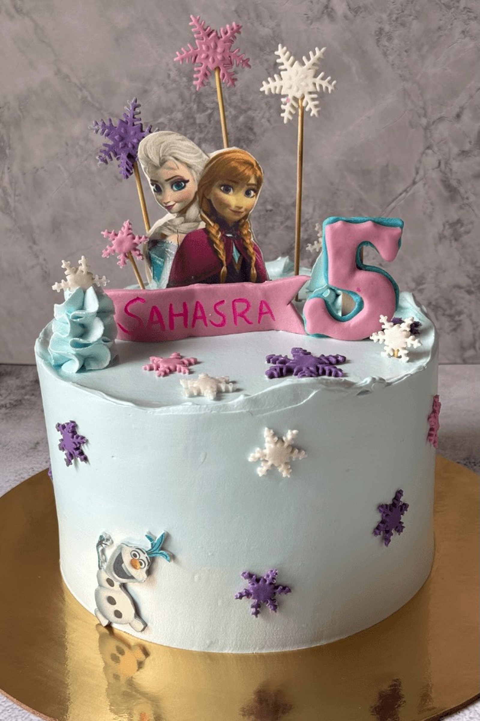 Decorated with snowflakes, icy blue cream finish, and Frozen characters