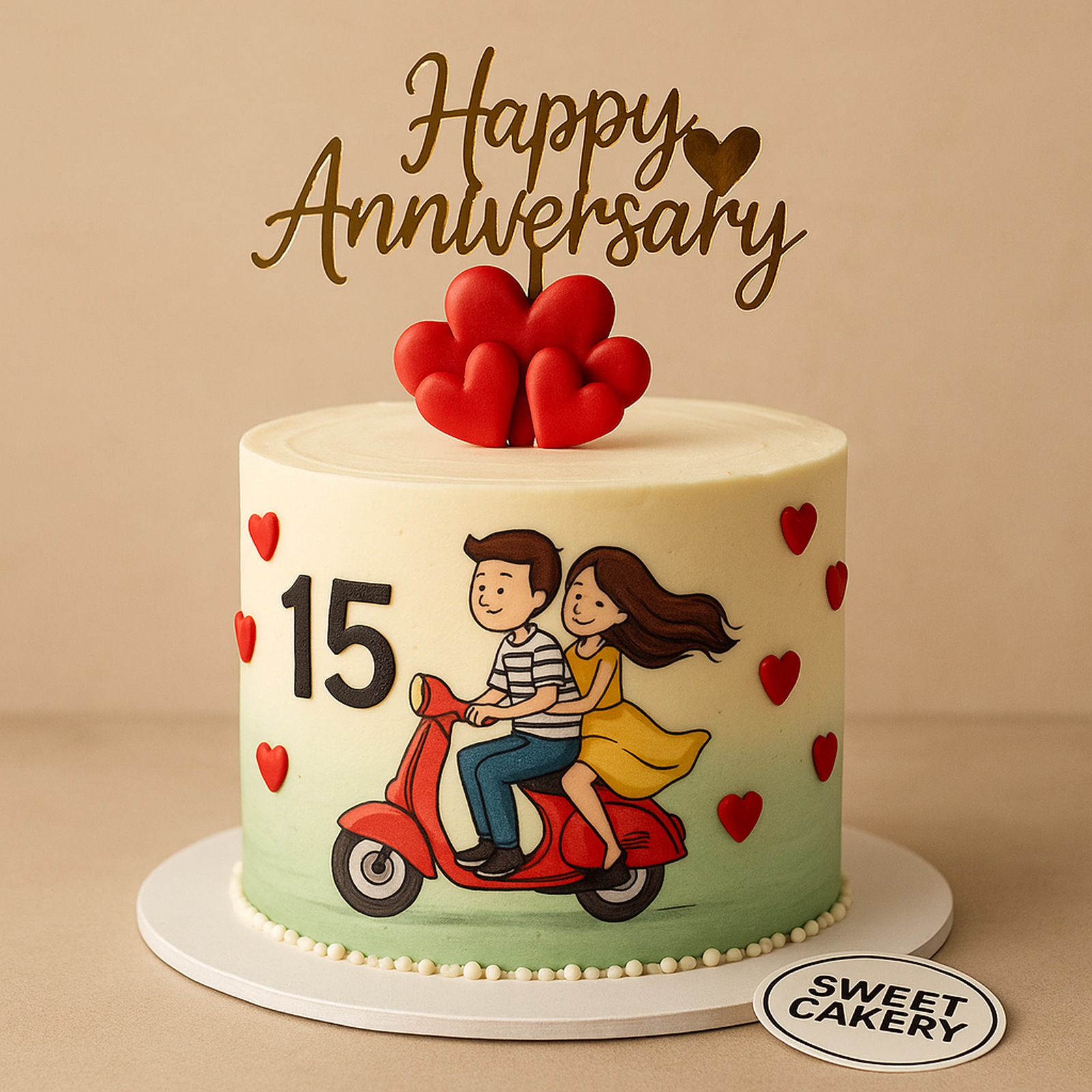 Make your anniversary extra special with our romantic Heart Theme Cake. This stunning cake features a charming couple on a scooter, surrounded by hearts, symbolizing love, joy, and togetherness. The cake is topped with the heartfelt message “Happy Anniversary,” adding a personal touch to your celebration.