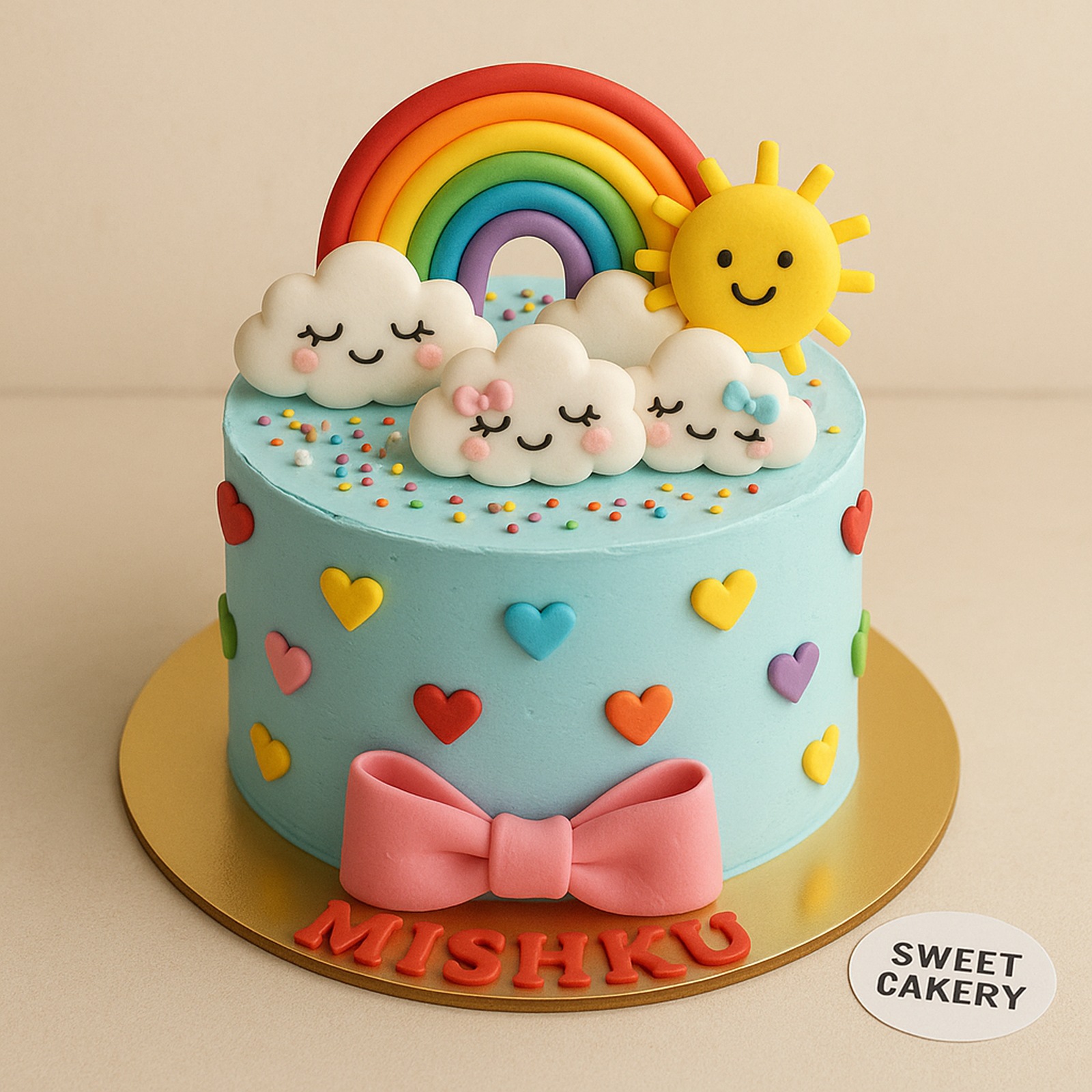 Bring joy to celebrations with this rainbow sunshine cake, featuring colourful hearts, a smiling sun, and cheerful clouds. Perfect custom cake in Bangalore.