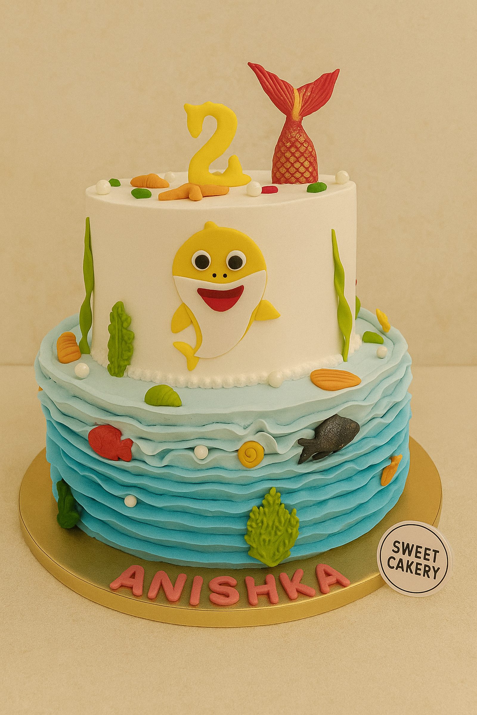 Underwater Baby Shark birthday cake with cream finish, fondant sharks, ocean waves, colourful fish, shells